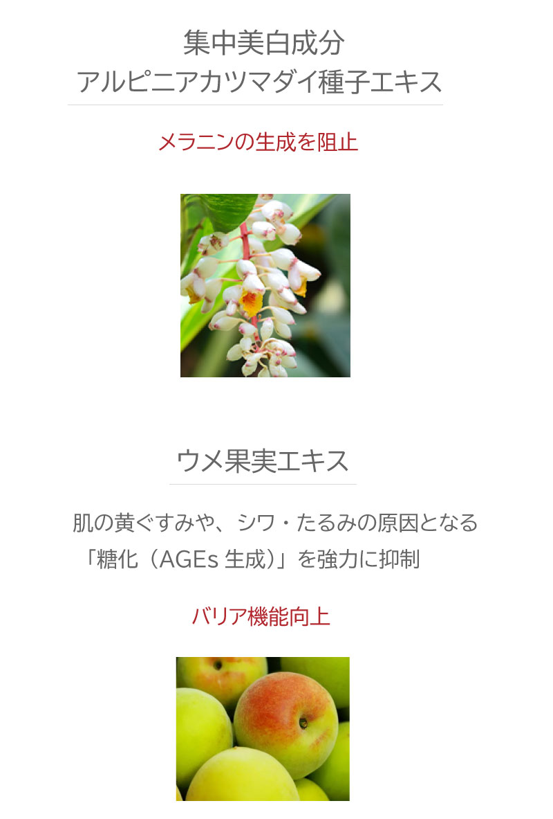 BG、濃グリセリン、カルボキシビニルポリマー、1,2-ペンタンジオール、アルギニン、スクレロチウムガム、スクワラン、メドウフォーム油、トリエチルヘキサン酸グリセリル、セテアリルアルコール、ベヘニルアルコール、ラウロイルグルタミン酸ジ(コレステリル・ベヘニル・オクチルドデシル)、ジメチコン、セスキオレイン酸ソルビタン、SEステアリン酸グリセリル、ステアリン酸POE(20)ソルビタン、水添大豆リン脂質、党参抽出物加水分解液、アルピニアカツマダイ種子エキス、油溶性甘草エキス(2)、ウメ果実エキス、ジラウロイルグルタミン酸リシンナトリウム液、ステアロイルフィトスフィンゴシン、天然ビタミンE、精製水、フェノキシエタノール、香料