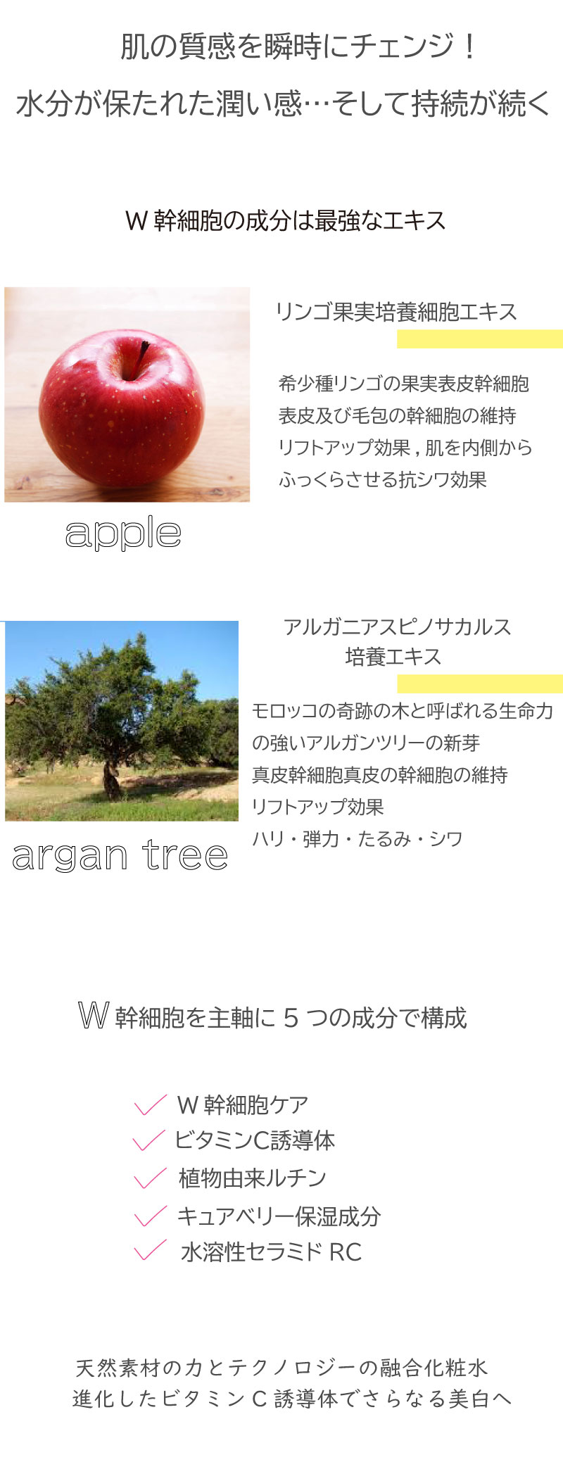 水、プロパンジオール、グリセリン、ペンチレングリコール、BG、シクロヘキサン-1,4-ジカルボン酸ビスエトキシジグリコール、イノシトール、トレハロース、(エイコサン二酸/テトラデカン二酸)ポリグリセリル-10、ベタイン、ジグリセリン、クレアチン、グリチルリチン酸2K、ジラウロイルグルタミン酸リシンNa、水添レシチン、マンダリンオレンジ果皮エキス、トコフェロール、コンフリー葉エキス、クダモノトケイソウ果実エキス、アルカリゲネス産生多糖体、ウメ果実エキス、アシタバ葉/茎エキス、スクワラン、カンゾウ根エキス、テトラヘキシルデカン酸アスコルビル、グルコシルルチン、イソマルト、α-グルカン、グルコシルセラミド、リンゴ果実培養細胞エキス、キサンタンガム、レシチン、アルガニアスピノサカルス培養エキス、ビルベリー葉エキス、PEG-60水添ヒマシ油、フェノキシエタノール